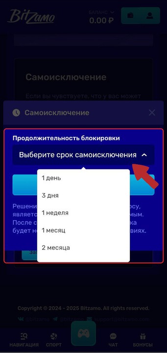 Выберите срок самоисключения — от 1 дня до 6 месяцев.