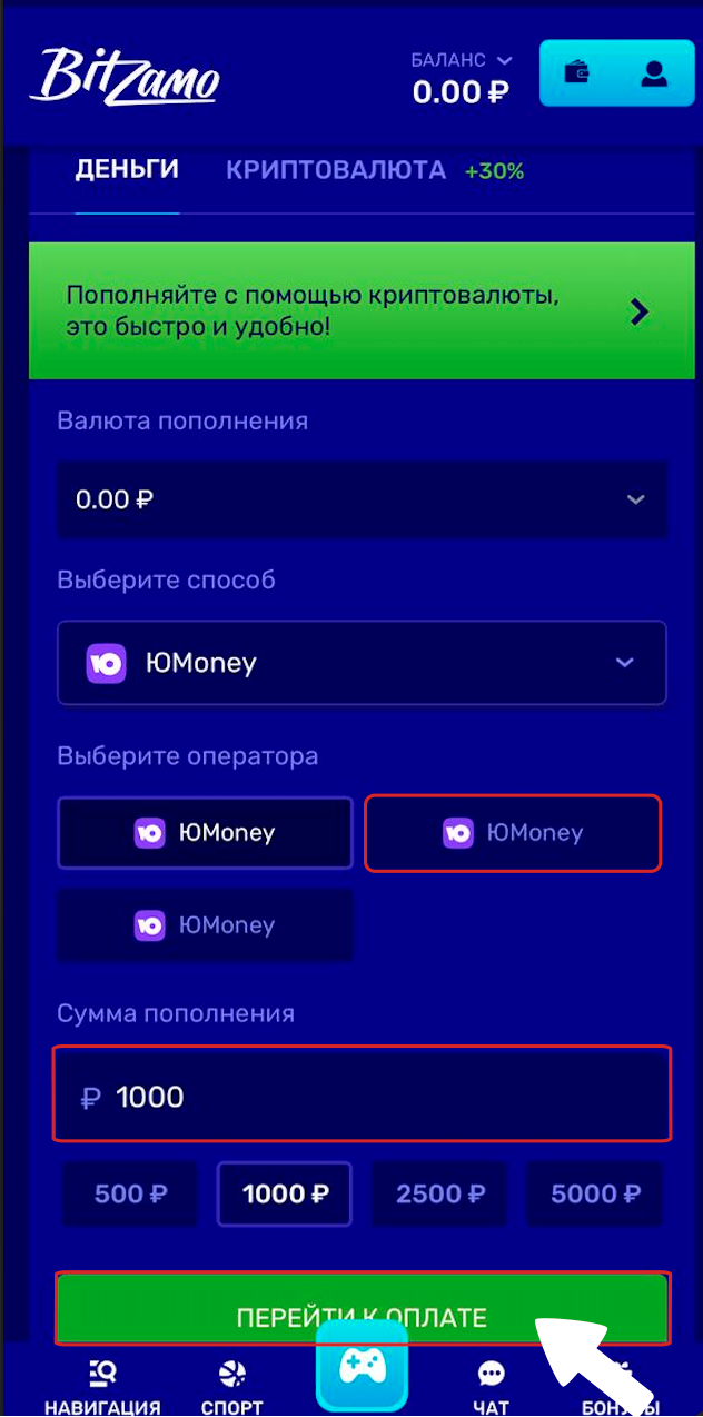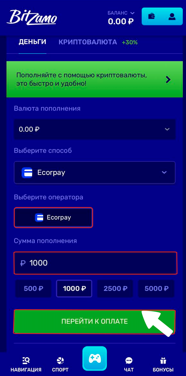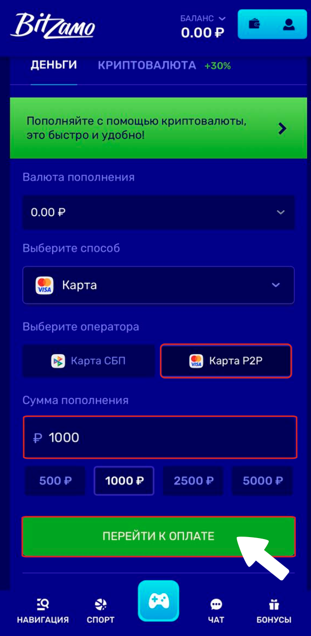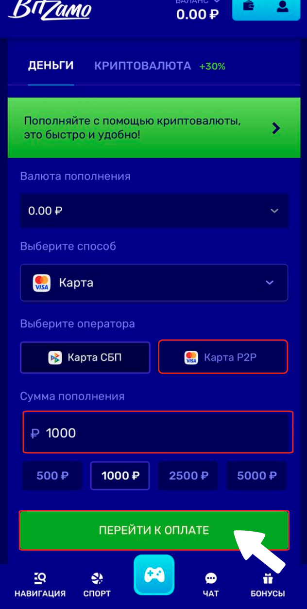 1. Выберите оплату картой, платежный метод и укажите сумму