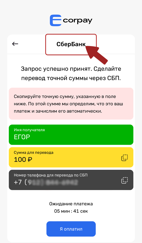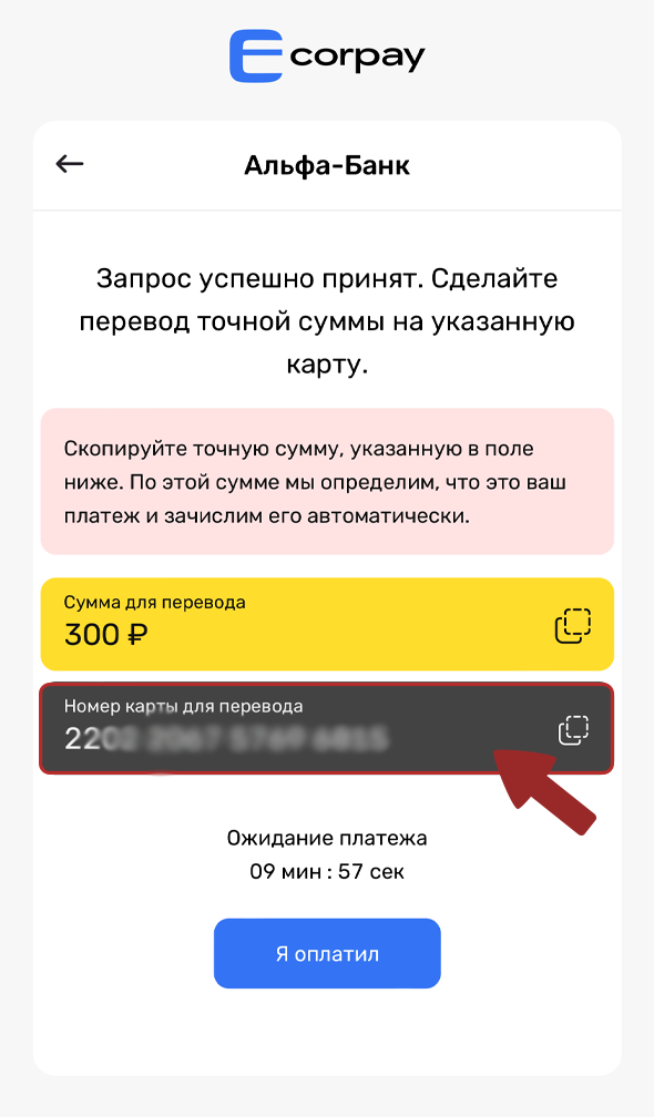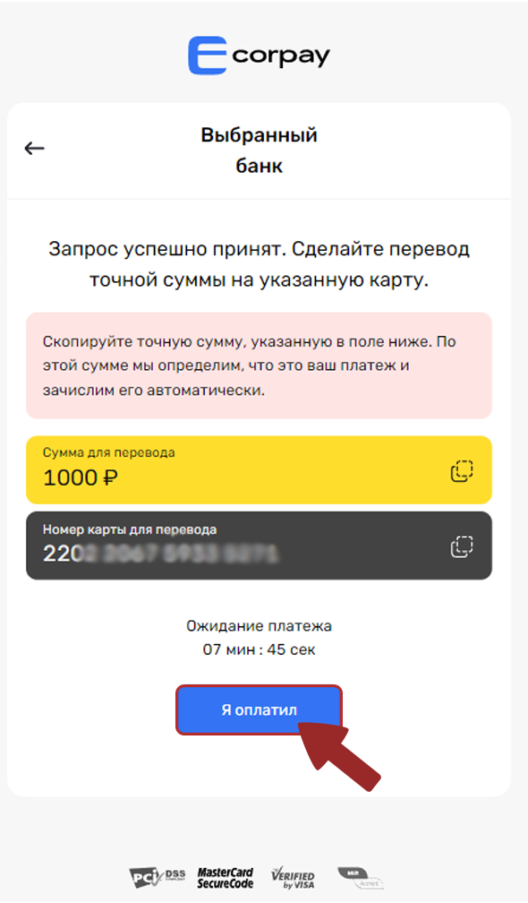 Important! Pay attention to the name of the bank, it is important to make a transfer by number and select the account of the specified bank in the application. Accompany with a picture from the banking application.