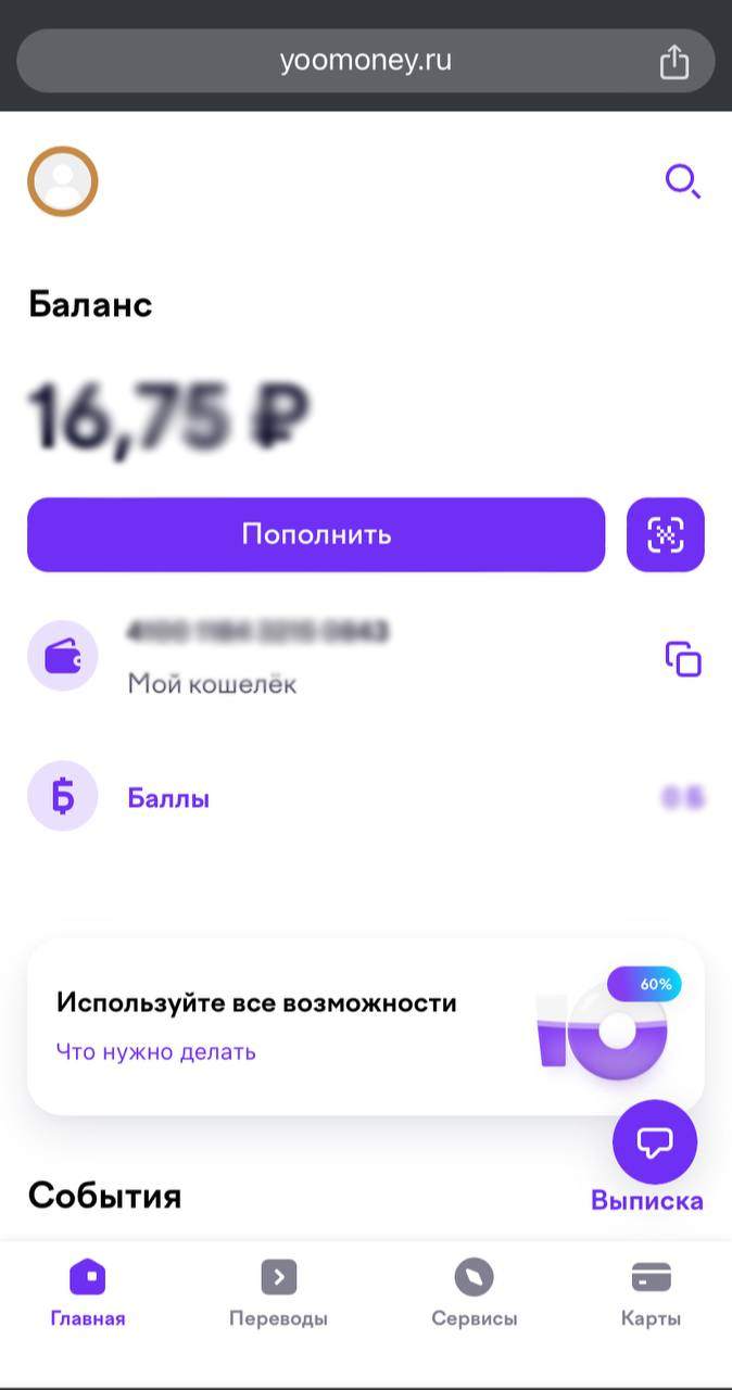 1. Зайдите в ваш личный кабинет кошелька Юmoney, после пролистайте ниже.