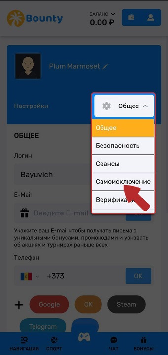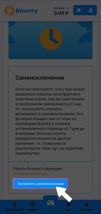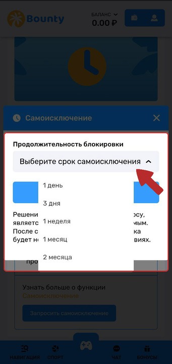 Выберите срок самоисключения — от 1 дня до 6 месяцев.