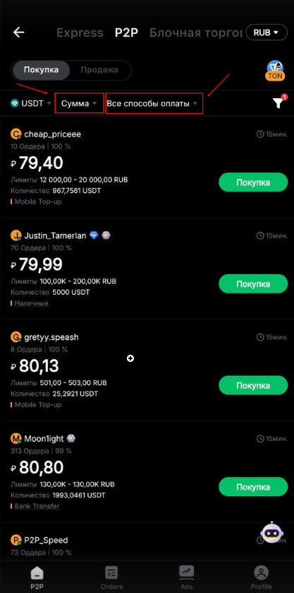 2. Выберите метод оплаты «P2P трейдинг» – сделки напрямую между пользователями платформы.