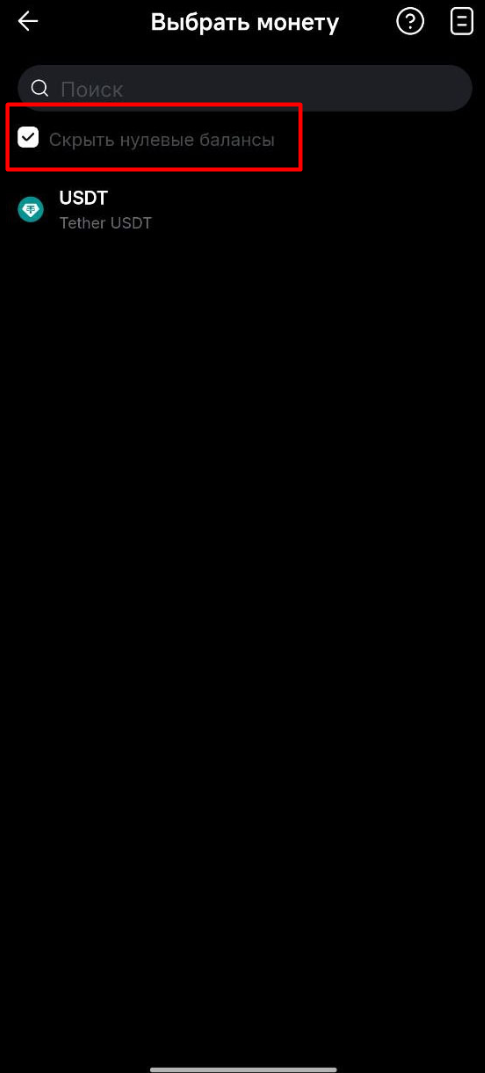 6. Найдите и выберите валюту, которую выбрали для депозита. Для удобства поставьте галочку «Скрывать нулевые балансы», чтобы отображались только доступные активы.