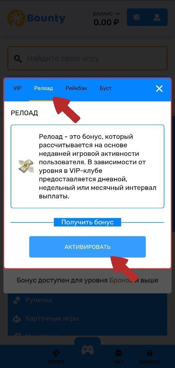 Релоад — это бонус, который рассчитывается на основе недавней игровой активности пользователя. В зависимости от уровня в VIP-клубе предоставляется дневной, недельный или месячный интервал выплат.