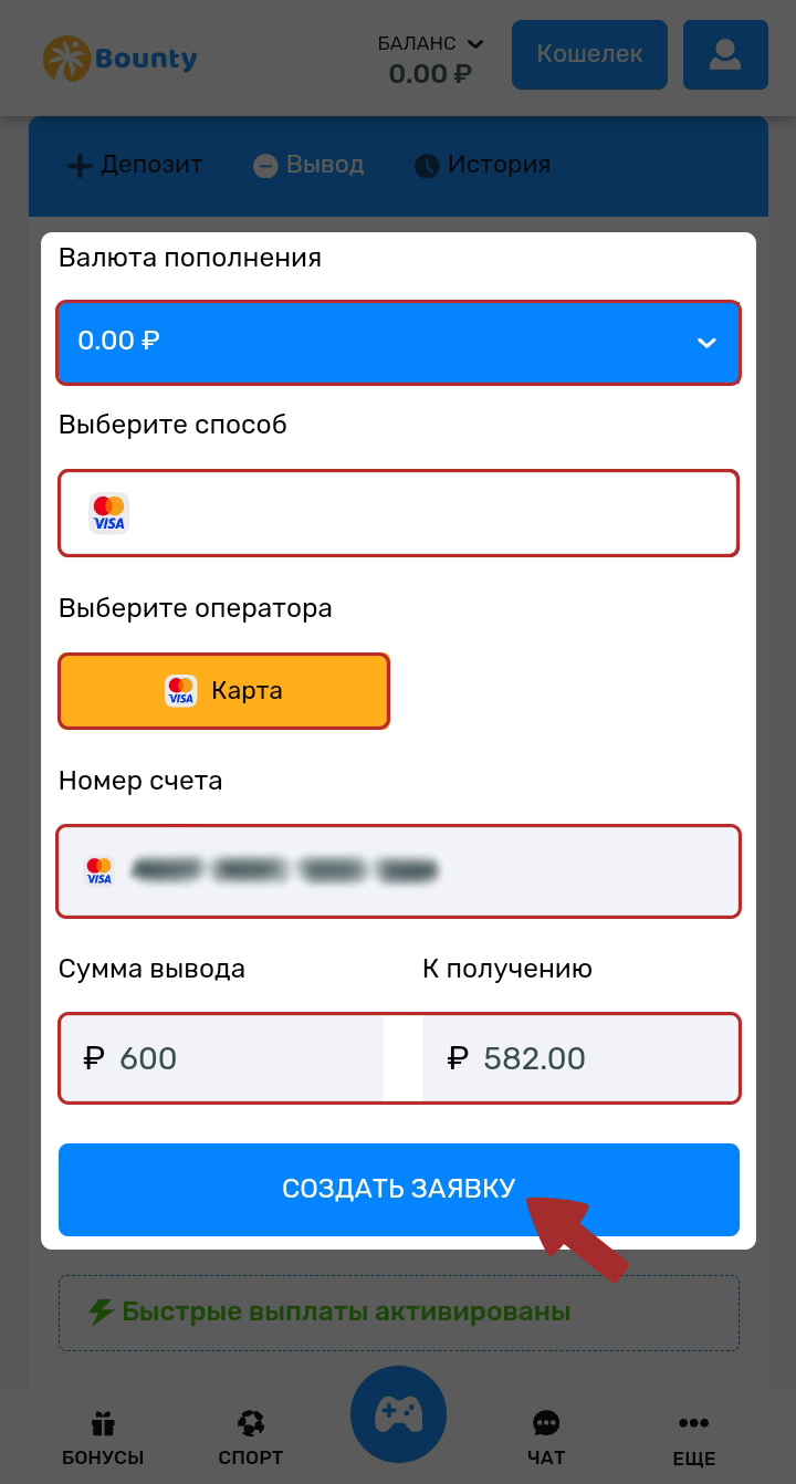 1. Выберите платежный метод Карта, введите номер карты, сумму и создайте заявку.