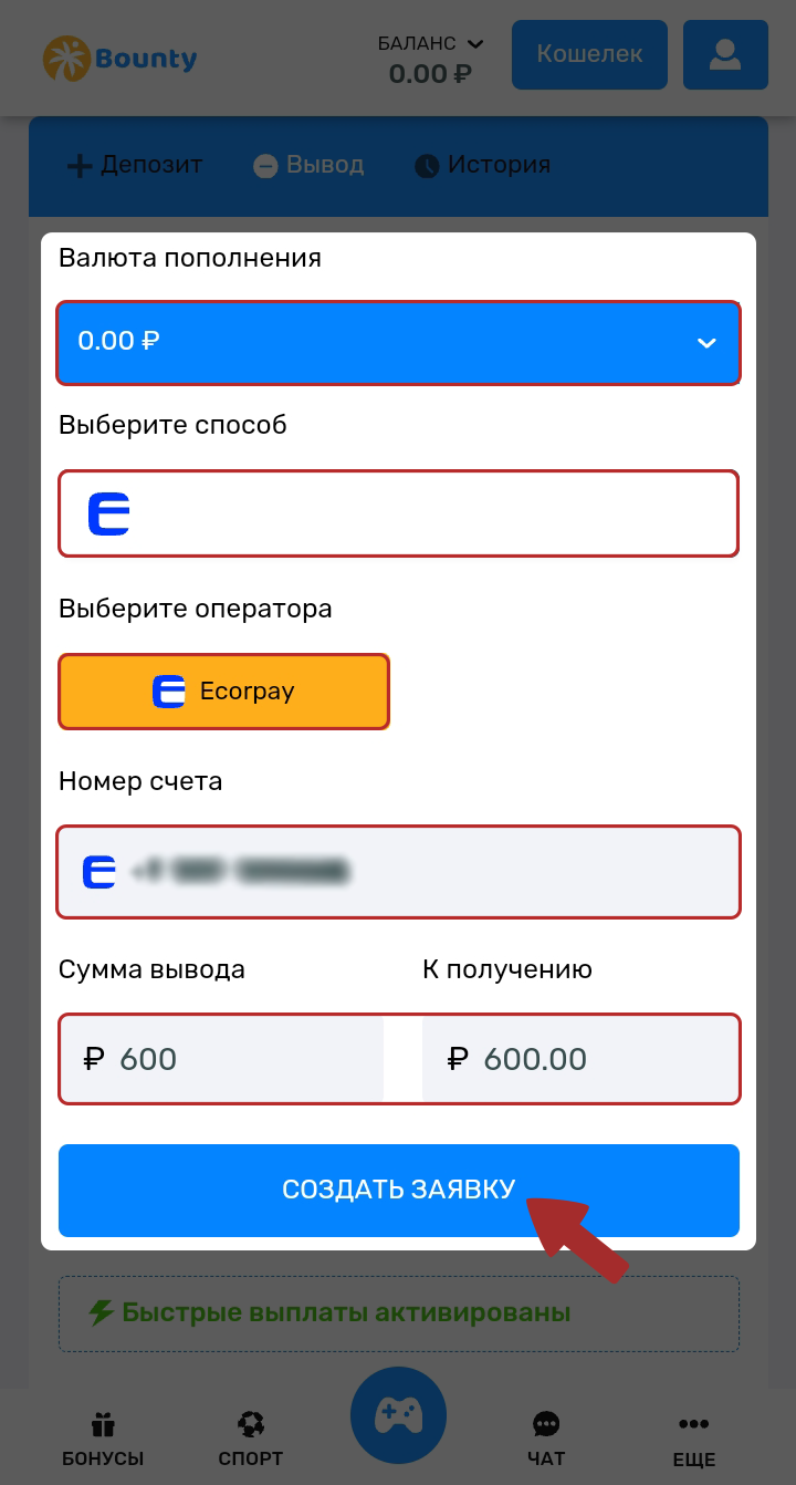 2. Выберите платежный метод Ecorpay, введите номер счета, сумму и создайте заявку.