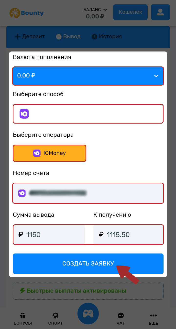 1. Выберите платежный метод ЮMoney, введите номер счета, сумму и создайте заявку.