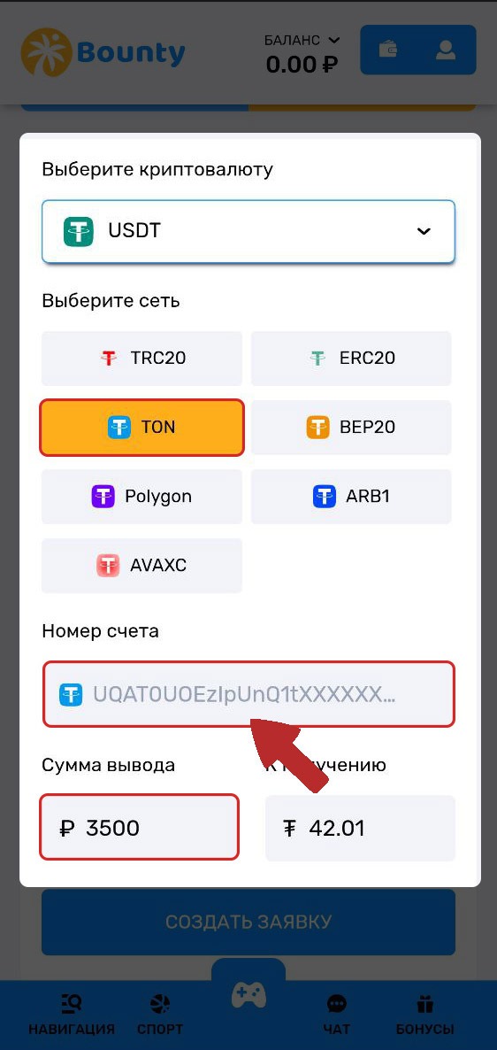 4. Выберите сеть для перевода, введите адрес вашего кошелька и сумму вывода