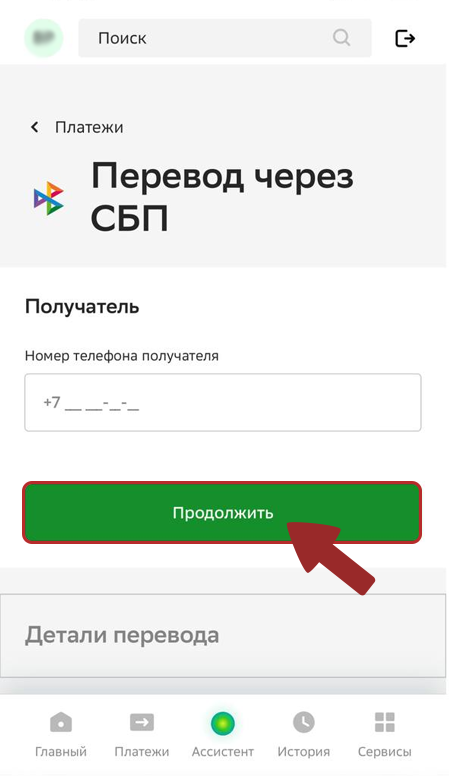 4. Open the bank application, select transfer by number, specify the number, bank and amount