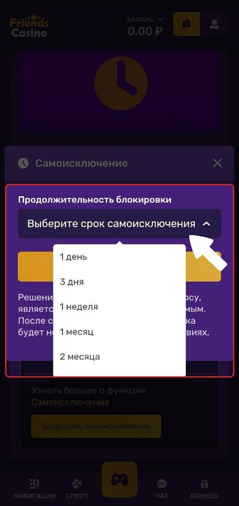 Выберите срок самоисключения — от 1 дня до 6 месяцев.