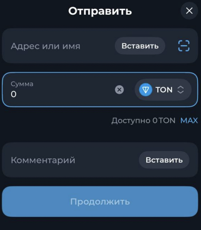 Вставьте адрес кошелька или отсканируйте QR для перевода, укажите сумму и комментарий.