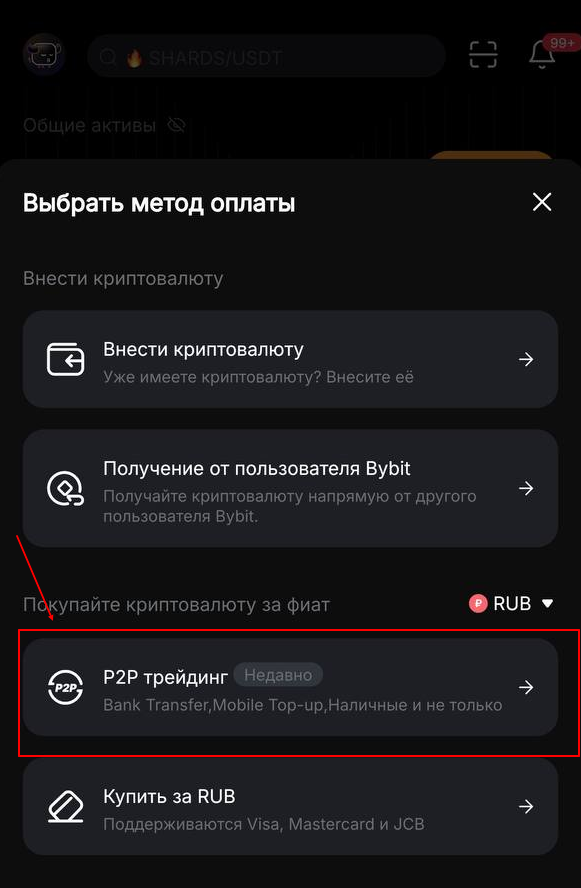 2. Выберите метод оплаты «P2P трейдинг» – сделки напрямую между пользователями платформы.