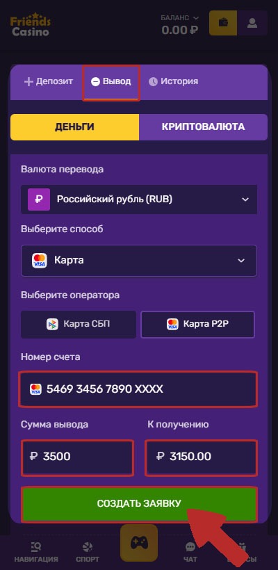 2. Затем выберите подходящий для вас способ вывода, укажите сумму и нажмите на кнопку Создать заявку.