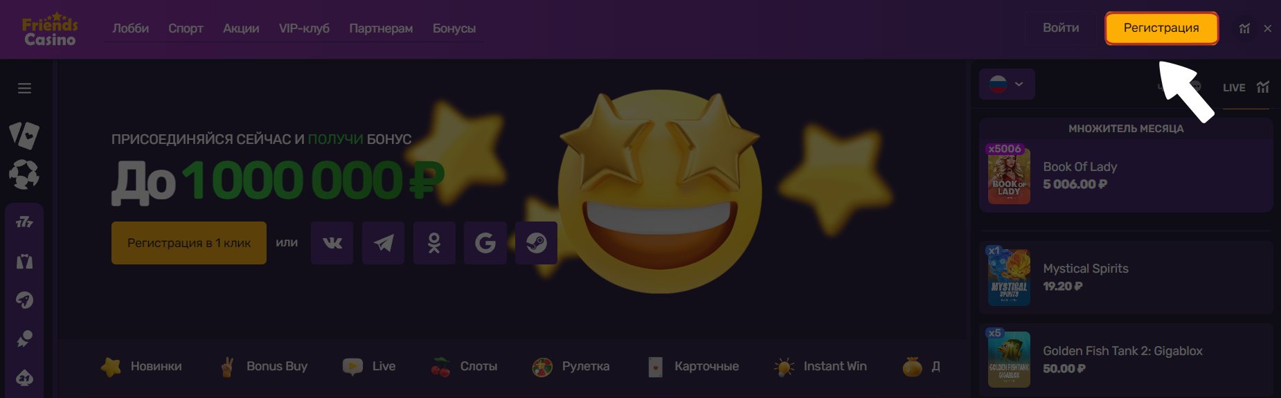 На нашем сайте доступно множество вариантов для прохождения регистрации, такие как: в 1 клик, по номеру телефона, по логину и через социальные сети.