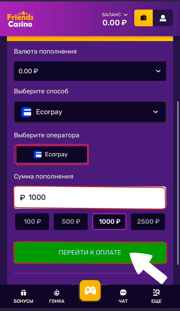 5) После того, как ваш баланс кошелька Ecorpay будет пополнен, вы сможете пополнить баланс казино. Для этого, повторите процедуру из пункта 1.