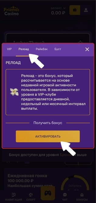 Релоад — это бонус, который рассчитывается на основе недавней игровой активности пользователя. В зависимости от уровня в VIP-клубе предоставляется дневной, недельный или месячный интервал выплат.