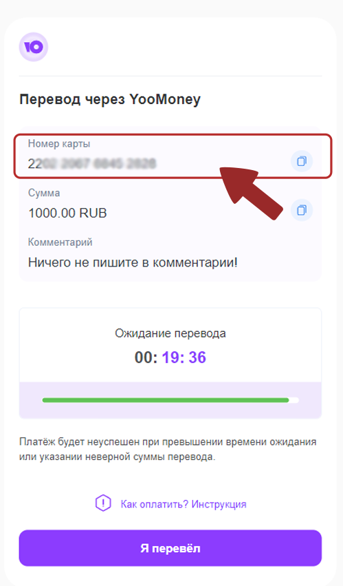 Important! Pay attention to the name of the bank, it is important to make a transfer by number and select the account of the specified bank in the application. Accompany with a picture from the banking application.