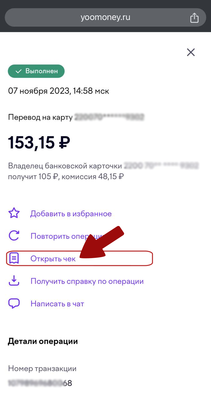 3. Нажмите на кнопку «Получить чек». Чек сохранится на вашем устройстве и вы можете отправить его по электронной почте, в мессенджере, или сохранить в виде файла.