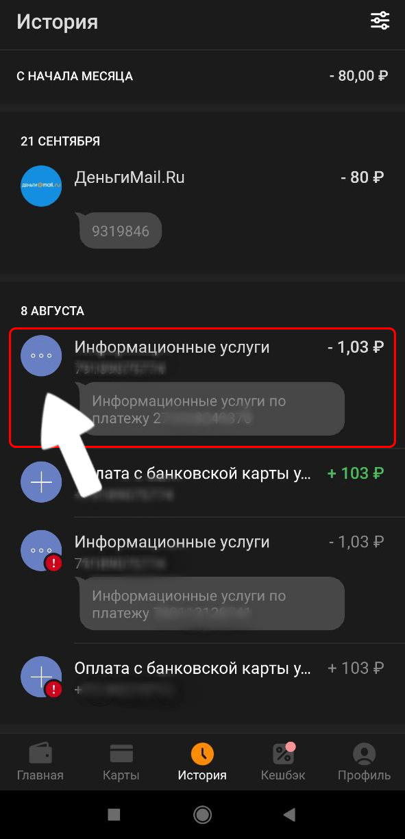 2. В истории операций, выберите операцию, которая Вас интересует.