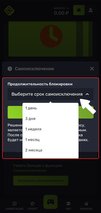 4. Выберите срок самоисключения — от 1 дня до 6 месяцев.