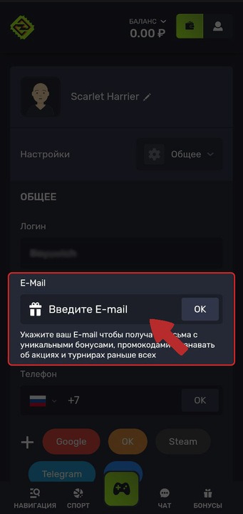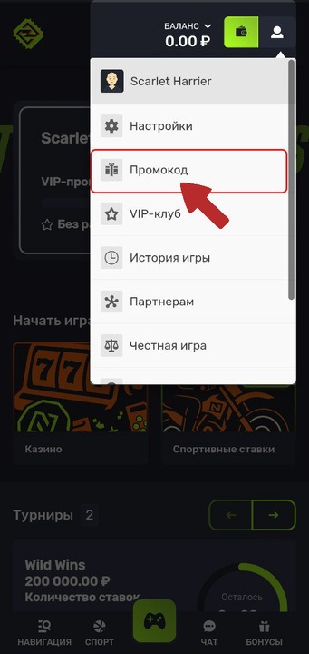 Получив промокод из Telegram-канала и перейдя на сайт, откройте профиль и выберите вкладку “Промокод”