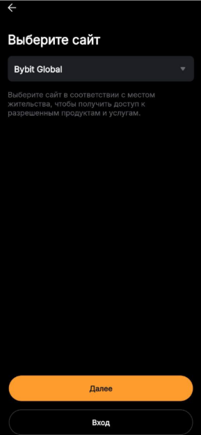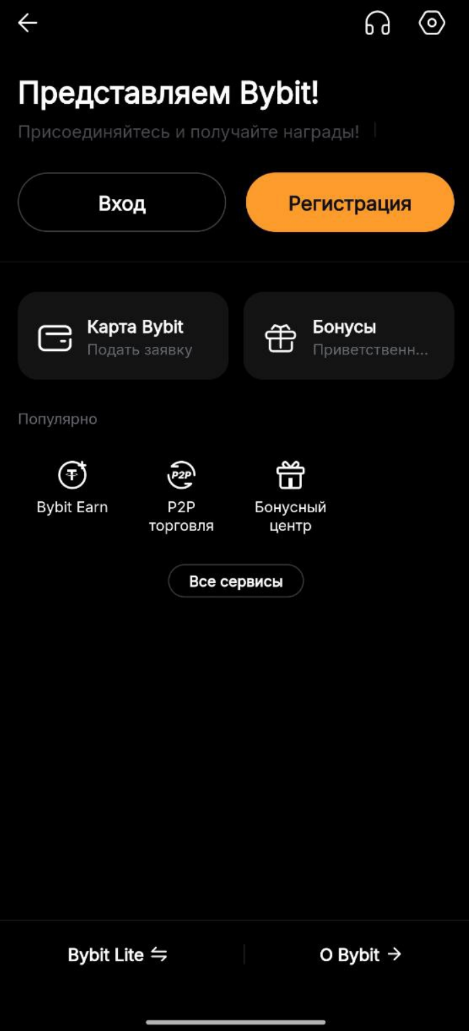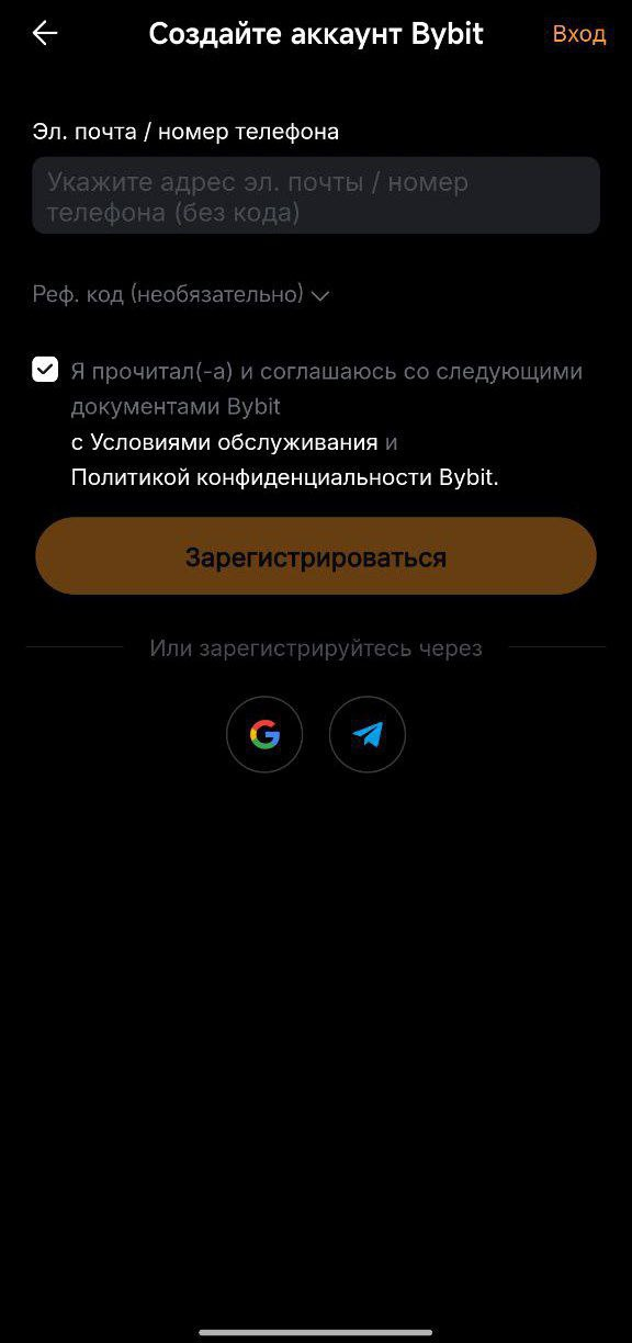 Скачайте приложение Bybit через магазин приложений (Google Play или App Store) и нажмите кнопку «Регистрация / Вход».