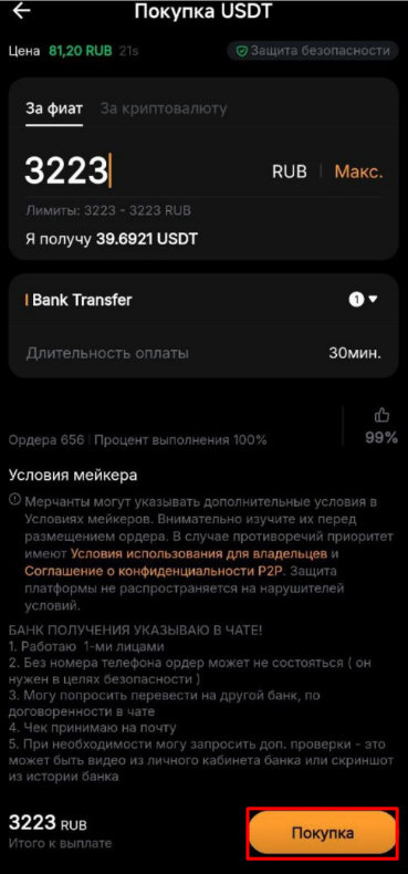 4. После того, как вы нашли подходящую сумму, метод оплаты и согласны с условиями сделки – можете нажать кнопку «Покупка».