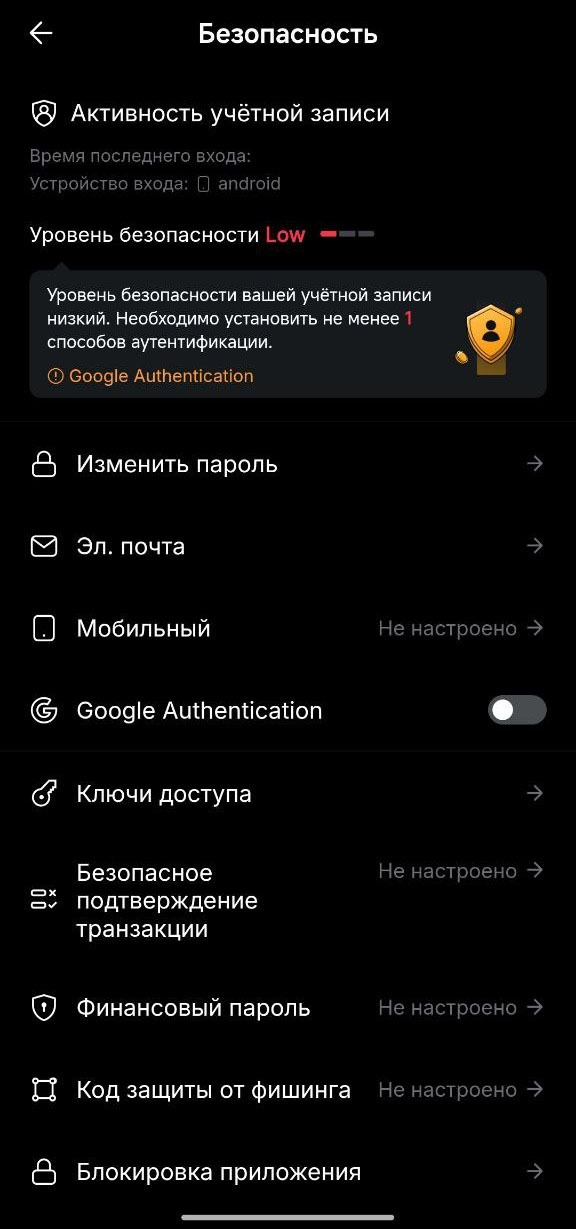 Без этого действия вывод с кошелька ограничен. Поднять уровень безопасности можно разными методами, но самый безопасный и удобный, это «Google Authenticator».