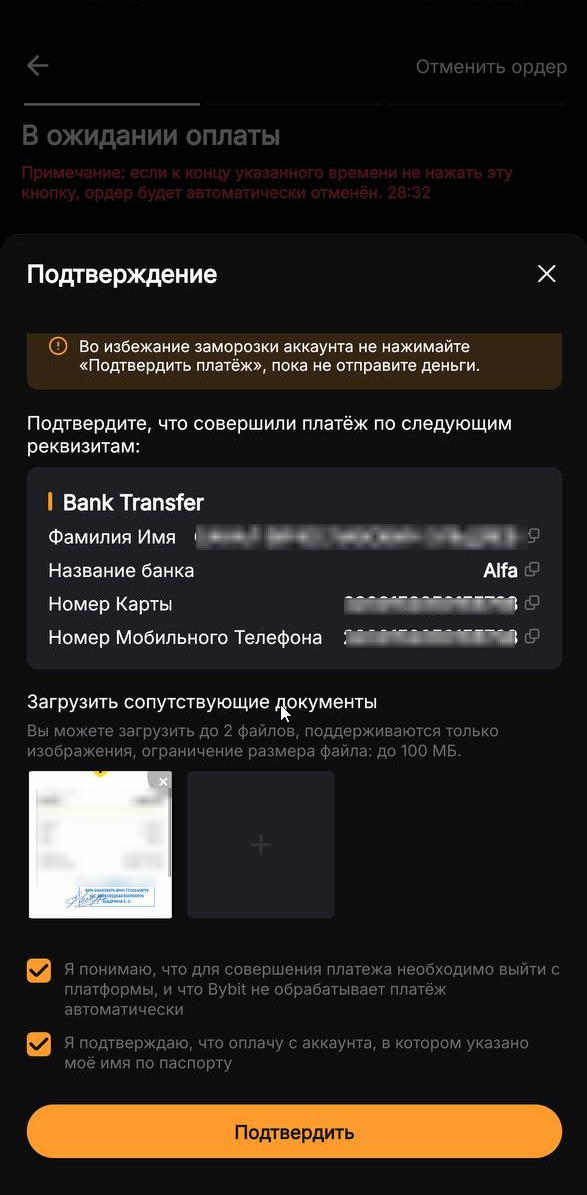 6. Загрузите чек об оплате и нажмите «Подтвердить».