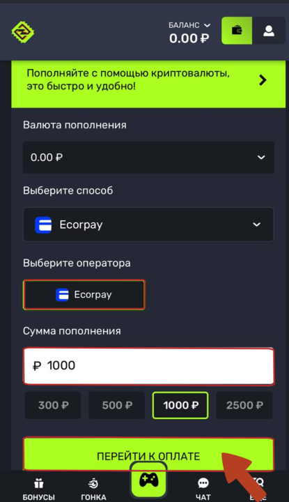 5) После того, как Ваш баланс кошелька Ecorpay будет пополнен, Вы сможете пополнить баланс казино. Для этого, повторите процедуру из пункта 1.