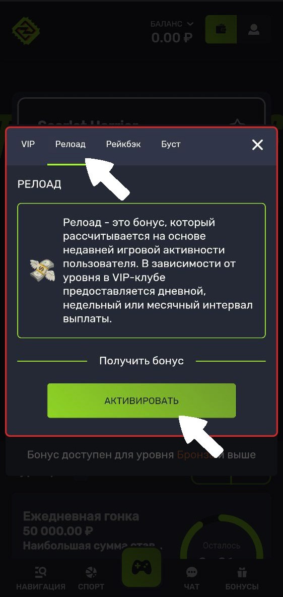 Релоад - это бонус, который рассчитывается на основе недавней игровой активности пользователя. В зависимости от уровня в VIP-клубе предоставляется дневной, недельный или месячный интервал выплаты.
