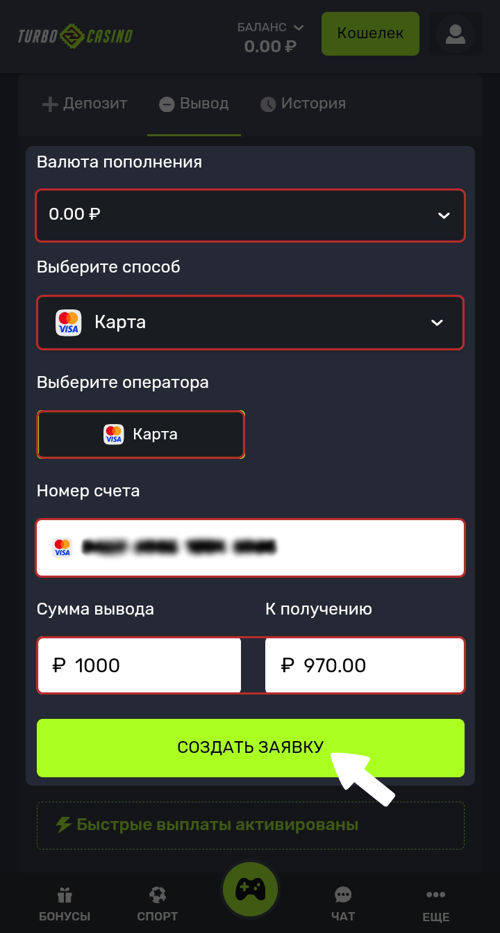 1. Выберите платежный метод Карта, введите номер карты, сумму и создайте заявку.