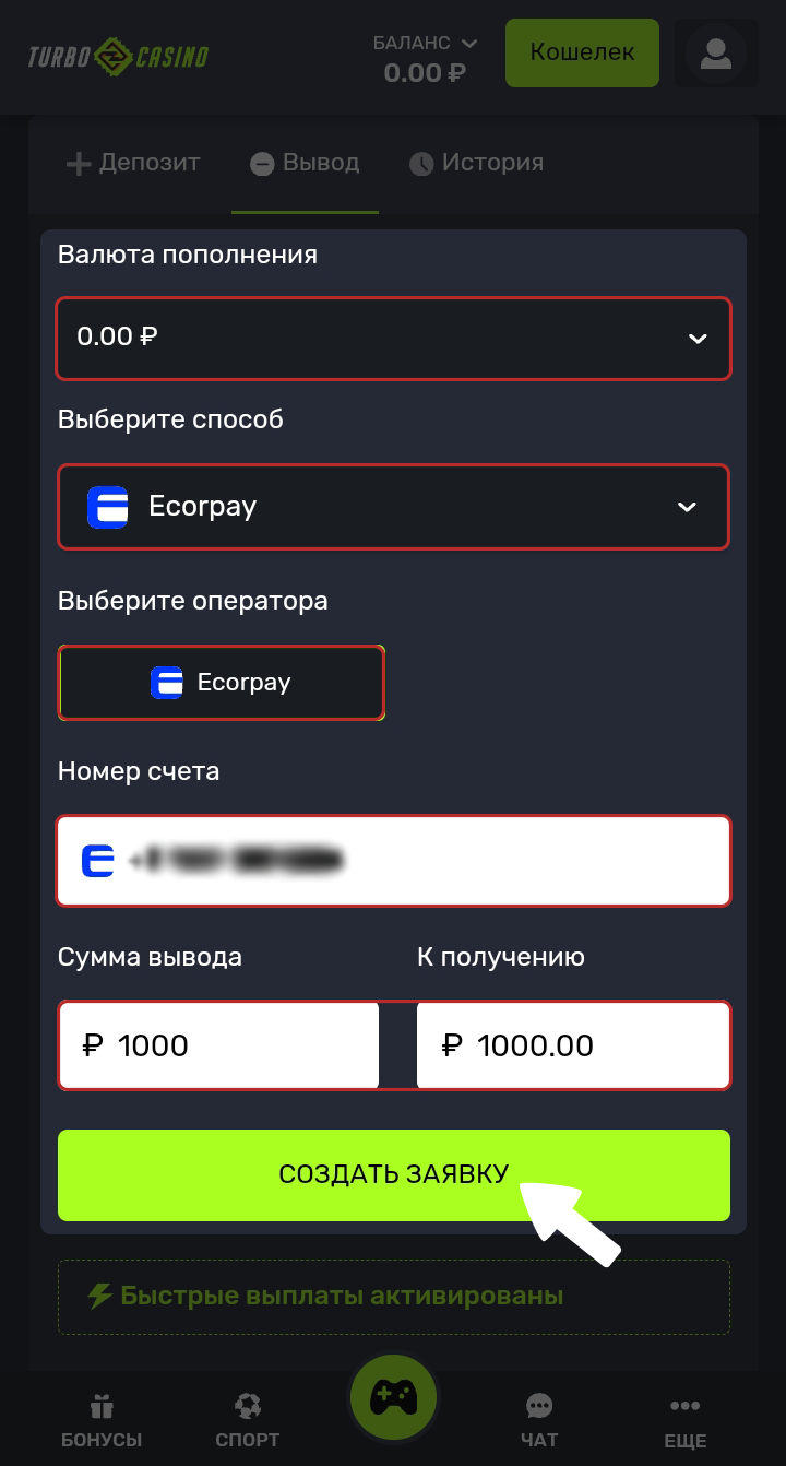 2. Выберите платежный метод Ecorpay, введите номер счета, сумму и создайте заявку.
