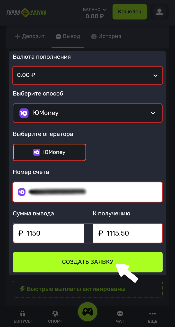 1. Выберите платежный метод ЮMoney, введите номер счета, сумму и создайте заявку.