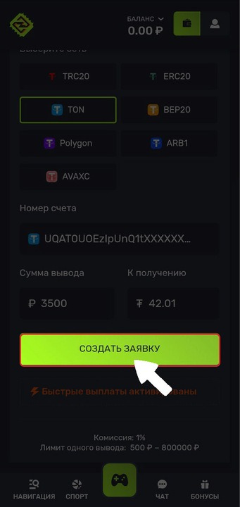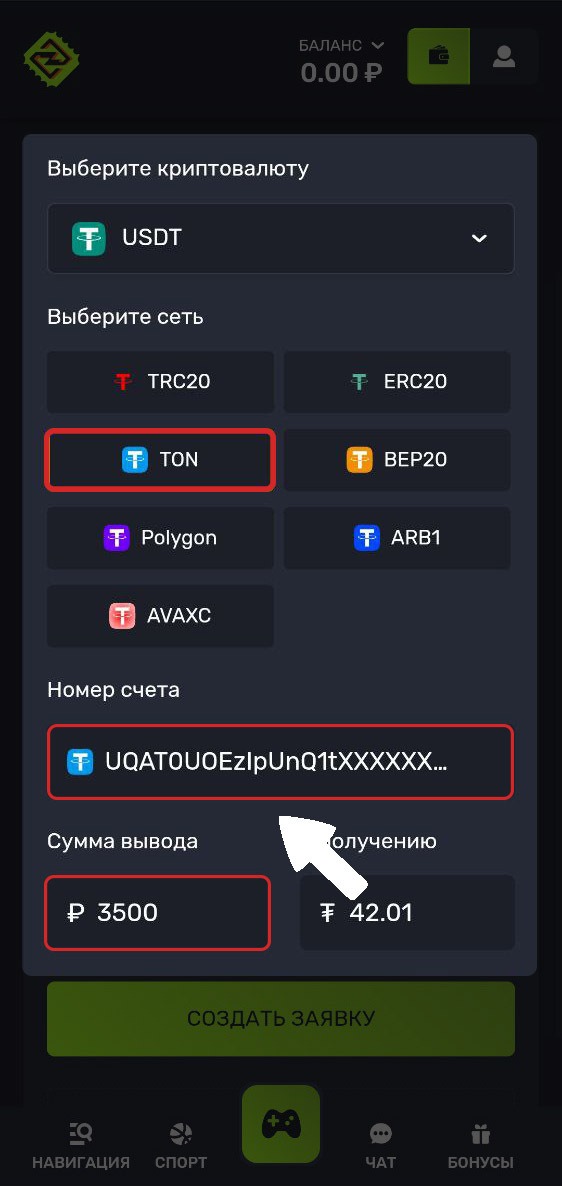 4. Выберите сеть для перевода, введите адрес вашего кошелька и сумму вывода