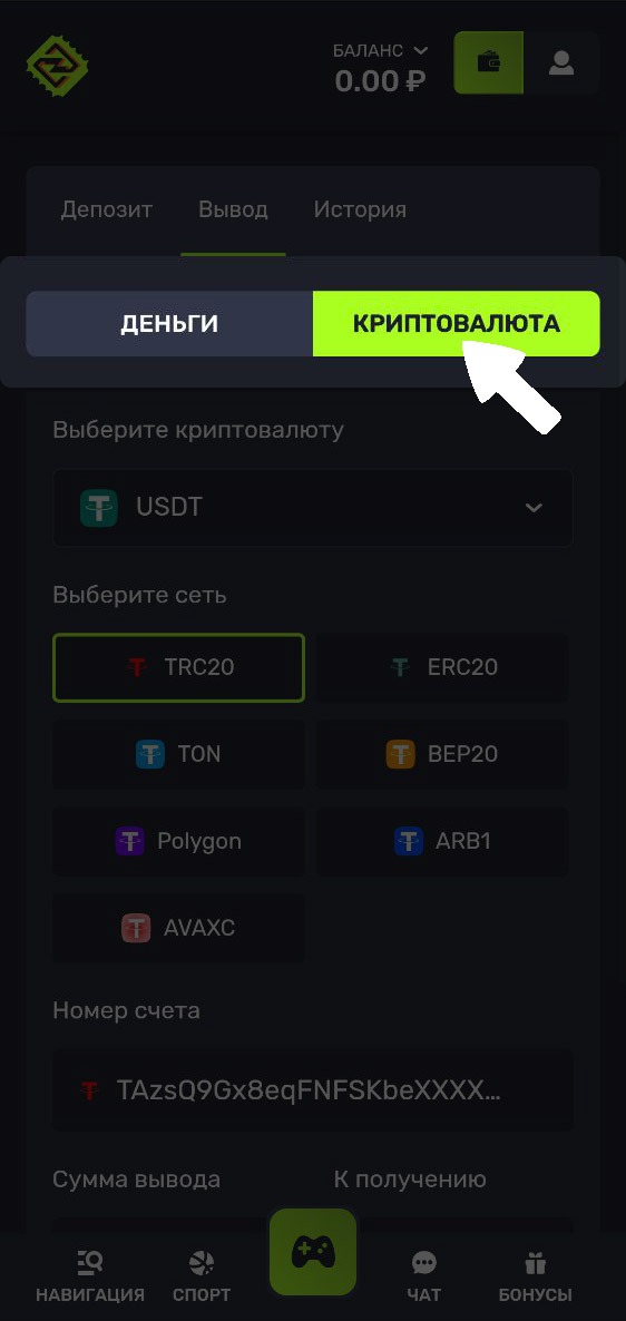 4. Выберите сеть для перевода, введите адрес вашего кошелька и сумму вывода